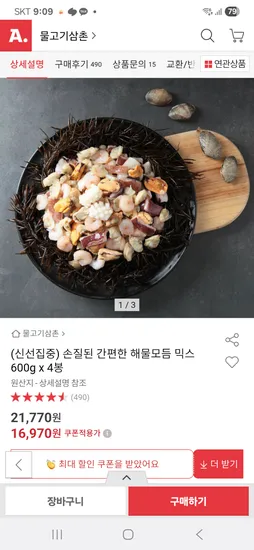 옥션)손질된 간편한 해물모듬 믹스 600g x 4봉 16,970원 무배