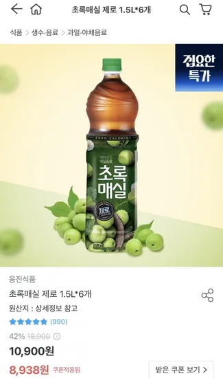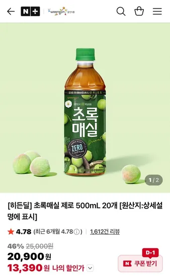 웅진 초록매실 제로 500ml 24병 외 (19,884원 / 무료)