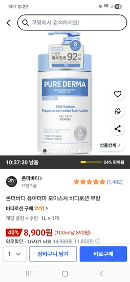 온더바디 퓨어더마 모이스처 바디로션 무향 1L 1개