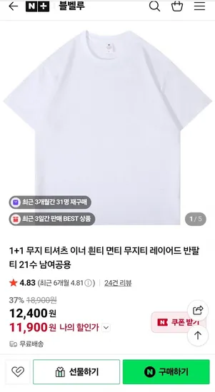 무지 기본티셔츠 21수 2개