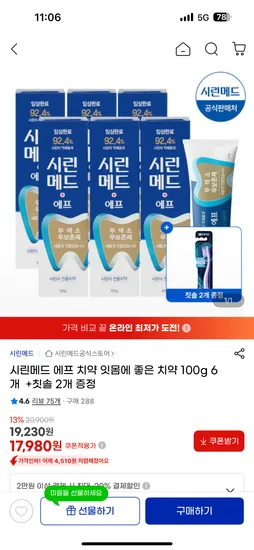 시린메드 에프 잇몸에 좋은 치약 100g 6개 칫솔 2개