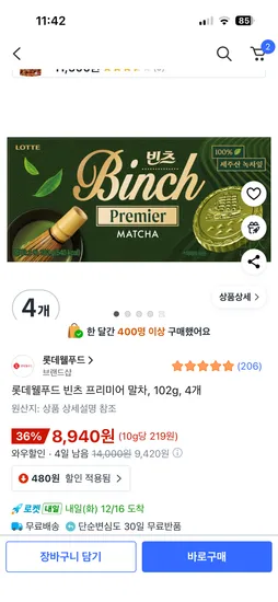 롯데웰푸드 빈츠 프리미어 말차 102g 4개