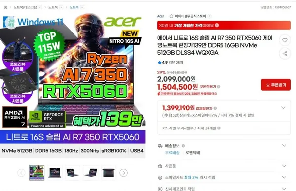 에이서 니트로 16S 슬림 R7 350 RTX5060 게이밍노트북