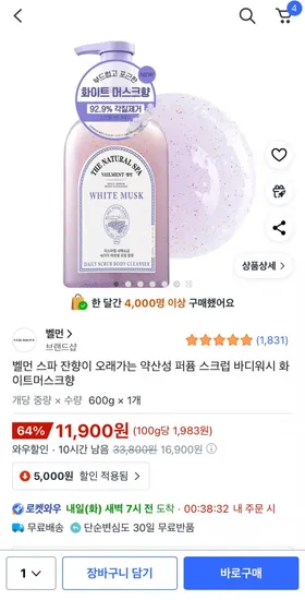 벨먼 스파 약산성 퍼퓸 스크럽 바디워시 화이트머스크향 600g 1개