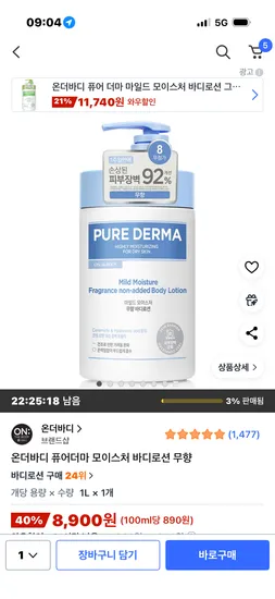 온더바디 퓨어더마 모이스처 바디로션 무향 1L 1개