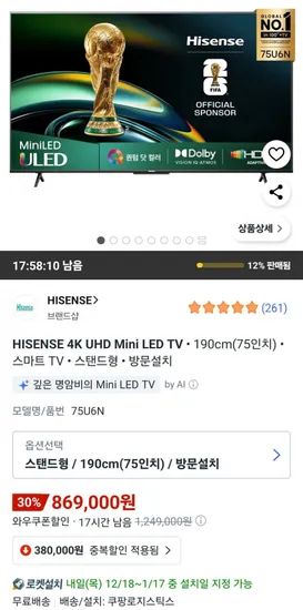 하이센스 4K UHD Mini LED 75인치 스마트 TV