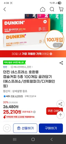 던킨 네스프레소 호환용 캡슐커피 5종 100개입