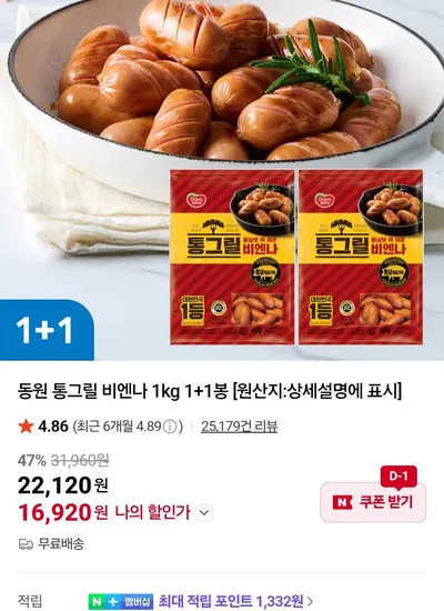 동원 통그릴 비엔나 1kg 1+1