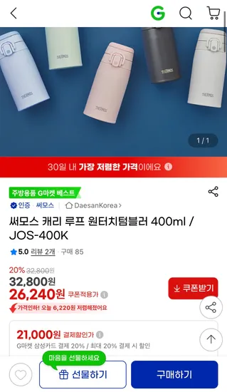 써모스 캐리루프 원터치 텀블러 400ml