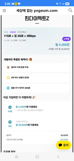 핀다이렉트 6개월 11GB 일2GB 3Mbps 밀리의서재 2만상품권